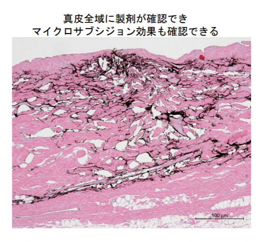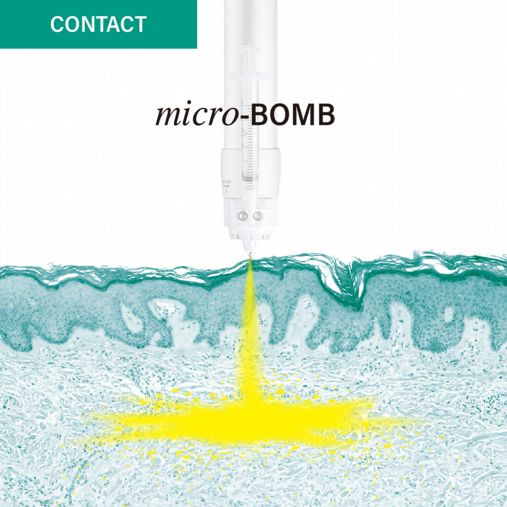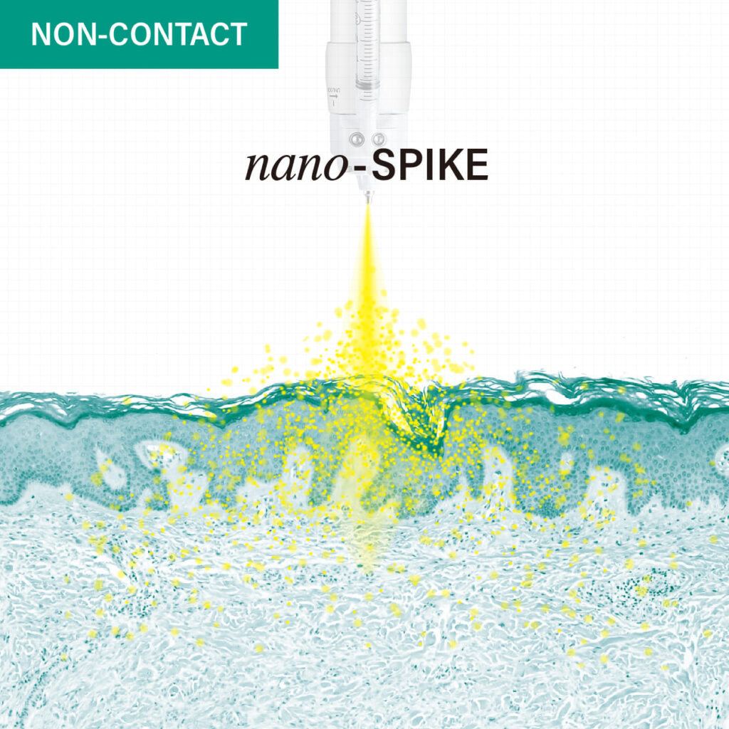 専用の機器で高圧のエネルギーを生み出し、微細な薬液を高速で噴射することで、皮膚表面に均一かつ浅く薬剤を届けることが可能です。