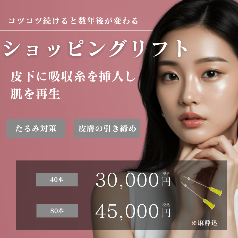 老け見えの大きな要因となる口元、頬、フェイスラインの緩みに試して頂きたいのがショッピングリフト。髪よりも細い溶ける糸を挿入することでお肌を引き締めていきます。